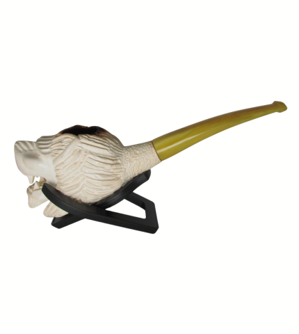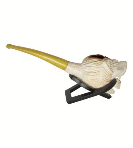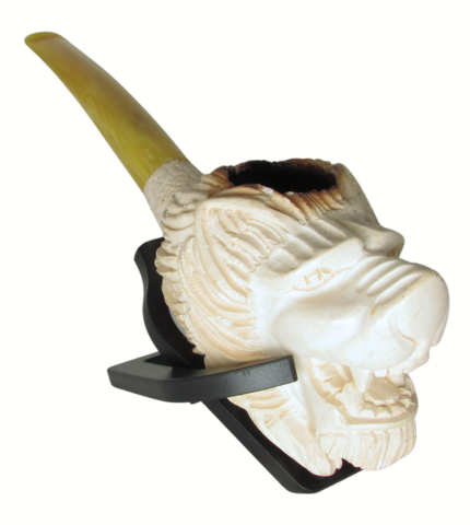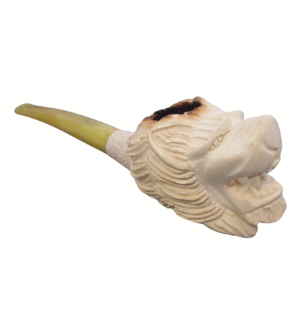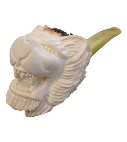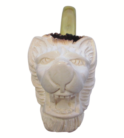 This is an intricately carved tobacco pipe made from Meerschaum. Likely Turkish in origin, this pipe's bowl is carved in the shape of a snarling lion. The bowl transitions to a yellow acrylic stem which is expertly threaded onto the shank. Sits nicely on a flat surface, too!