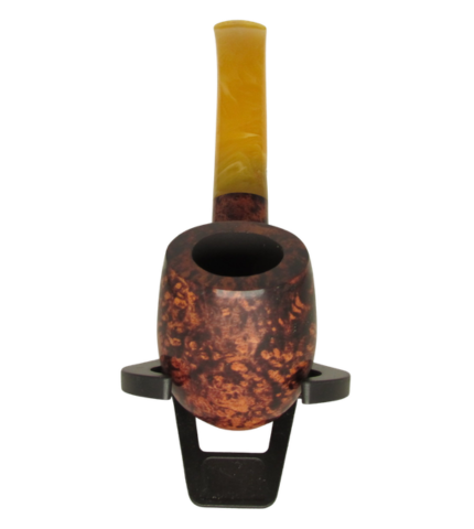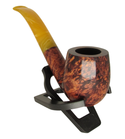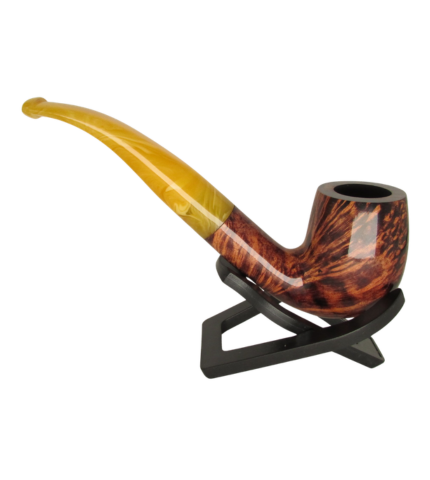 A Mahogany stain accentuates the grain of the top-quality briar.  Hand-finished shape fitted with a hand-cut yellow and white swirled acrylic stem. A classic larger bent billiard for a longer smoke.