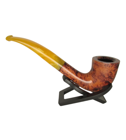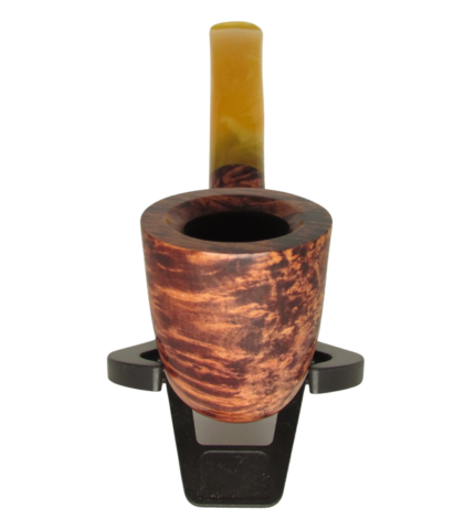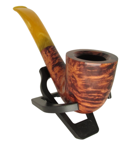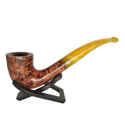 A deep rich burgundy red which matures with grace and charm into a deep almond brown with smoking. Hand-finished shape fitted with a hand-cut yellow acrylic stem with white accents. A thick-walled bent Dublin, this pipe fits well in your hand.